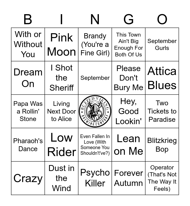 This bingo card has a free space and 84 words: Mama Told Me (Not To Come), Summer of '69, Brandy (You're a Fine Girl), Bohemian Rhapsody, Another Brick in the Wall, Pt. 2, Free Bird, Me and Bobby McGee, Mary Jane's Last Dance, Cocaine, Dreams, Hotel California, Stairway To Heaven, I Shot the Sheriff, Hey, Good Lookin', I'm So Lonesome I Could Cry, With or Without You, Crazy, Dream On, Just Dropped In (To See What Condition My Condition Is In), I've Got A Woman, Ballroom Blitz, Please Don't Bury Me, Operator (That's Not The Way It Feels), Cat's in the Cradle, Living Next Door to Alice, That The Way (I Like It), More Than a Woman, Dancing in the Dark, Brown Eyed Girl, Knockin' On Heavens Door, Low Rider, Play That Funky Music, Get Down Tonight, Papa Was a Rollin' Stone, Marquee Moon, Search and Destroy, Psycho Killer, I'm Not In Love, Attica Blues, Pharaoh's Dance, Ghost Rider, Mammas Don't Let Your Babies Grow up to Be Cowboys, Tulsa Time, Le Freak, Margaritaville, Imagine, Pink Moon, You're The One That I Want, Smoke on the Water, War Pigs, I'll Be There, Lean on Me, This Town Ain't Big Enough For Both Of Us, Bang a Gong (Get It On), (Don't Fear) The Reaper, Black Magic Woman, Dust in the Wind, September, Wildfire, Two Tickets to Paradise, Oh! Sweet Nuthin', Heart of Glass, Killer Queen, Baby Come Back, Got To Give It Up, Lovely Day, American Pie, Superstition, September Gurls, I Will Survive, Blitzkrieg Bop, Rhinestone Cowboy, Comfortably Numb, Tangled Up in Blue, Even Fallen In Love (With Someone You Shouldn't've?), Forever Autumn, If You Leave Me Now, A Horse With No Name, Layla, Oliver's Army, You're So Vain, Three Little Birds, Father and Son and Video Killed the Radio Star.