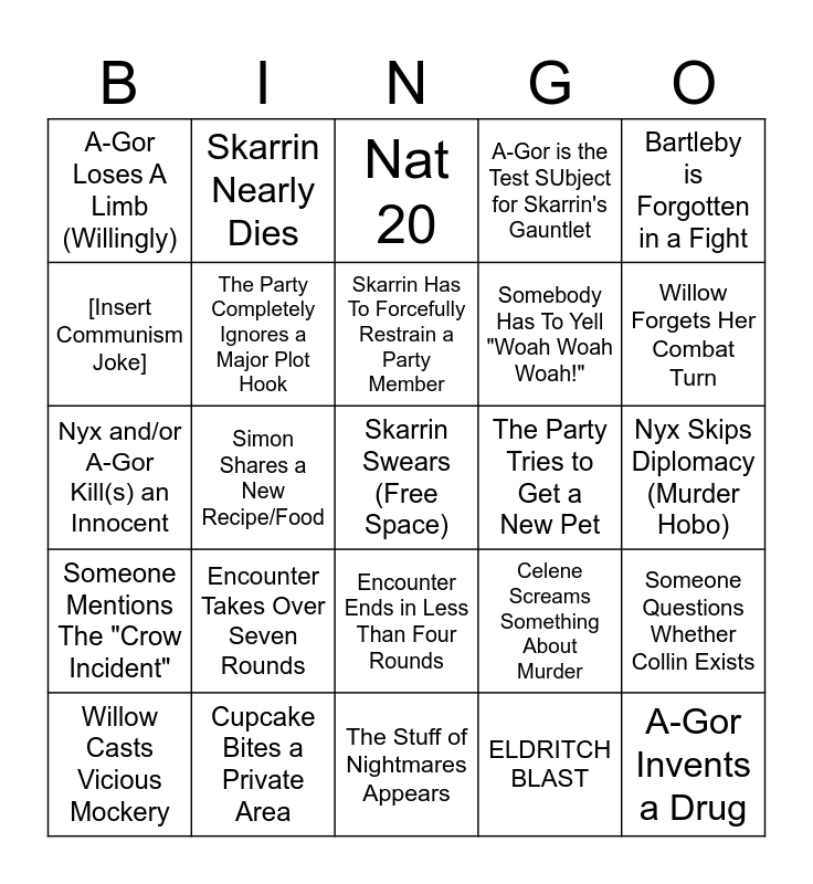 This bingo card has a free space and 44 words: Nyx Forgets Her Abilities, A-Gor Invents a Drug, Skarrin Drinks a Cup of Coffee, Willow Casts Vicious Mockery, Simon Has to Look Up A New Feature, ELDRITCH BLAST, Nat 20, Nat 1, Bartleby is Forgotten in a Fight, Cupcake Bites a Private Area, A-Gor is the Test SUbject for Skarrin's Gauntlet, The Party Tries to Get a New Pet, Encounter Ends in Less Than Four Rounds, Encounter Takes Over Seven Rounds, The Party Wakes Up Something They Shouldn't, The Stuff of Nightmares Appears, Someone Forgets What Items They Have, Nyx and/or A-Gor Kill(s) an Innocent, Willow Goes Down, Willow Forgets Her Combat Turn, Skarrin Nearly Dies, Skarrin Vaporises Someone, A-Gor Loses A Limb (Unwillingly), A-Gor Loses A Limb (Willingly), Nyx is Overly Edgy, Nyx Skips Diplomacy (Murder Hobo), Max Makes a Cursed Sound, Anti Plays Their Soundboard, Celene Screams Something About Murder, Someone Mentions The "Crow Incident", Someone Mentions "Happy Coffee", Someone Questions Whether Collin Exists, The Group Gets Sidetracked For No Reason, Simon Shares a New Random History Fact, Simon Shares a New Recipe/Food, Skarrin Ends Up Regretting Using His Gauntlet, A-Gor Has to be Restrained Forcefully, Nyx Has to be Restrained Forcefully, Skarrin Has To Forcefully Restrain a Party Member, [Insert Communism Joke], Somebody Has To Yell "Woah Woah Woah!", The Party Invents A Broken Build/Weapon, The Party Completely Ignores a Major Plot Hook and The Party Gets Isekai'd.