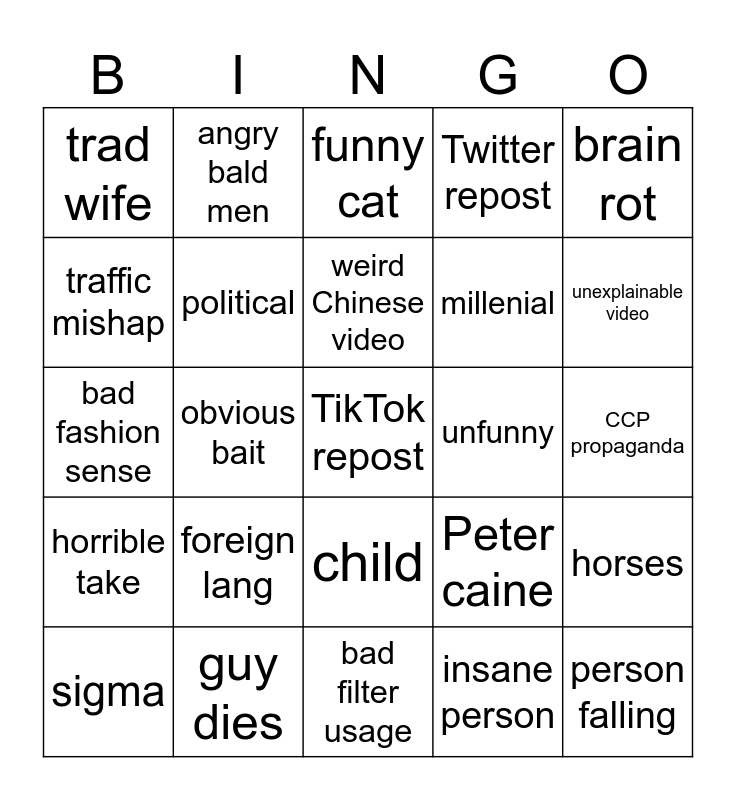 This bingo card has a free space and 24 words: foreign lang, guy dies, weird Chinese video, sigma, brain rot, trad wife, traffic mishap, angry bald men, unfunny, child, millenial, bad fashion sense, Peter caine, horses, political, insane person, CCP propaganda, funny cat, unexplainable video, obvious bait, person falling, horrible take, Twitter repost and bad filter usage.