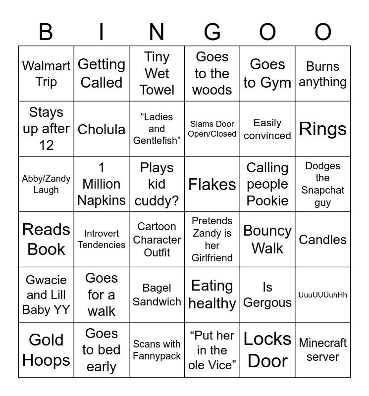 This bingo card has 48 words: Free!, Abby/Zandy Laugh, Weird Face, Bouncy Walk, Calling people Pookie, Eating healthy, Getting Called, Gets High, Burns anything, Goes to bed early, Stays up after 12, Goes to the woods, Introvert Tendencies, Reads Book, Minecraft server, Bagel Sandwich, Cholula, 1 Million Napkins, Lemons, Goes to Gym, Rings, Candles, Walmart Trip, “Ladies and Gentlefish”, “High Quality”, Slams Door Open/Closed, Cartoon Character Outfit, Sniped, Dodges the Snapchat guy, Flakes, Gets Hit On, Goes for a walk, Locks Door, Complains About Abi, Pretends Zandy is her Girlfriend, Scans with Fannypack, “Put her in the ole Vice”, Plays kid cuddy?, Gold Hoops, Breathes out the window, Is Gergous, Gwacie and Lill Baby YY, Tiny Wet Towel, Dubble Dip, Easily convinced, Out for a run, UuuUUUuhHh and Different voice.