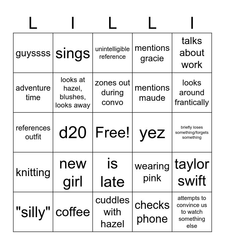 This bingo card has a free space and 29 words: "silly", mentions hazel while hazel is absent, d20, i'm so normal, guyssss, unintelligible reference, looks at hazel, blushes, looks away, new girl, yez, coffee, briefly loses something/forgets something, attempts to convince us to watch something else, cuddles with hazel, checks phone, looks around frantically, clutches head while breathing heavily, is late, knitting, talks about work, references outfit, wearing pink, references/makes us watch an edit, mentions maude, adventure time, mentions gracie, sings, taylor swift, zones out during convo and fake flirting.