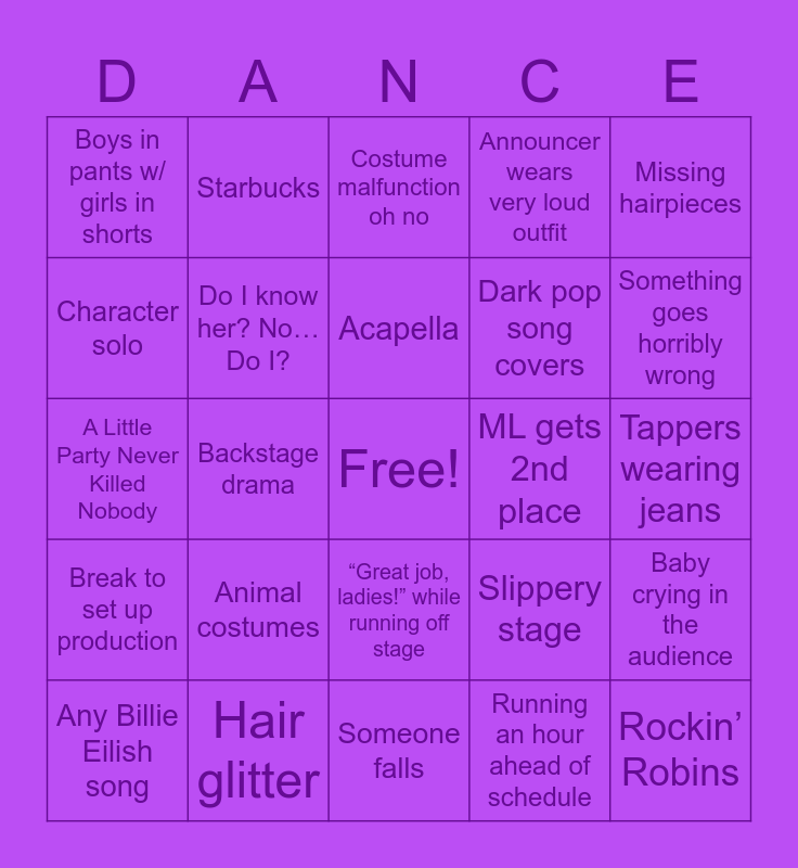 This bingo card has a free space and 54 words: Getting ready way earlier than necessary, Break to set up production, Screaming for no reason, Same costume multiple times, “Great job, ladies!” while running off stage, Announcer plugs instagram/tiktok, Announcer wears very loud outfit, Junge was in a celebrity mv, Character solo, Bench or chair props, Boys in pants w/ girls in shorts, Cha Cha Slide, Hair glitter, Any Billie Eilish song, Anything from The Greatest Showman, Someone falls, Rockin’ Robins, Dark pop song covers, Barbie routine, Tappers wearing jeans, Slippery stage, ML gets 1st place, ML gets 2nd place, Missing hairpieces, Sequin bikini costumes, Starbucks, Dance Moms references, Cupid Shuffle, Someone checks us in early >:(, Running an hour ahead of schedule, Someone cries, Miss ma’am there are children present, Miss ma’am you are a child, Miss-pronounced name, Costume malfunction oh no, Unnecessary props, A Little Party Never Killed Nobody, Baby crying in the audience, Little kid gets awwws at awards, Do I know her? No… Do I?, Lip syncing (non musical theatre), Dance dad moments, Wrong tights, Disney songs, Animal costumes, Any Britney Spears song, Any Adele song, Beach ball prop, Acapella, Backstage drama, Something goes horribly wrong, Nothing goes horribly wrong :), Mermaid Party and That dinosaur costume thing.
