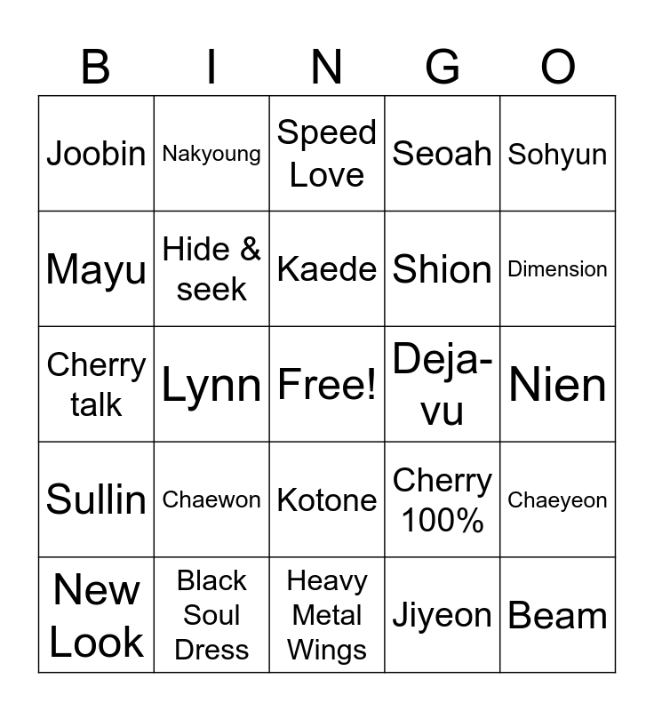 This bingo card has a free space and 67 words: Seoyeon, Hyerin, Jiwoo, Chaeyeon, Yooyeon, Soomin, Nakyoung, Yubin, Kaede, Dahyun, Kotone, Yeonji, Nien, Sohyun, Xinyu, Mayu, Lynn, Joobin, Hayeon, Shion, Chaewon, Sullin, Seoah, Jiyeon, Access, Generation, Rolex, Charla, Dimension, +82, Beam, Before the rise, Rising, Colorful, The baddest, New Look, Chowall, Cherry 100%, Cherry talk, Touch, Touch +, Hide & seek, Deja-vu, Dimension, ↀ, Girls Capitalism, Complexity, Black Soul Dress, Seoul Sonyo Sound, Cry Baby, Speed Love, Numeber 8, ⟡, Invincible, Rhodanthe, Heavy Metal Wings, 37.5 Celsius, Moto Princess, Oui, Enhanced Flower, Just Do It, Door, Farewell my first, Cherry gene Baddest Mix, Cherry Gene Hy- Fluid Mix, Cherry Gene Testarossa Mix and Girls never die.