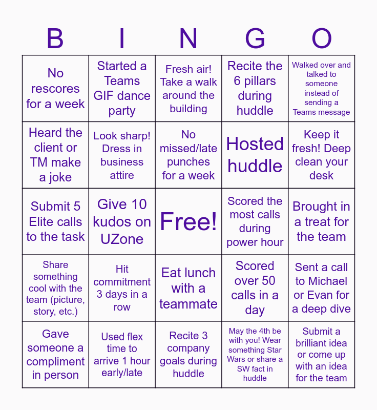 This bingo card has a free space and 24 words: Hit commitment 3 days in a row, Used flex time to arrive 1 hour early/late, No missed/late punches for a week, Gave someone a compliment in person, Walked over and talked to someone instead of sending a Teams message, No rescores for a week, Heard the client or TM make a joke, Started a Teams GIF dance party, Scored the most calls during power hour, Eat lunch with a teammate, Hosted huddle, Submit 5 Elite calls to the task, Scored over 50 calls in a day, Sent a call to Michael or Evan for a deep dive, Look sharp! Dress in business attire, May the 4th be with you! Wear something Star Wars or share a SW fact in huddle, Brought in a treat for the team, Fresh air! Take a walk around the building, Keep it fresh! Deep clean your desk, Give 10 kudos on UZone, Submit a brilliant idea or come up with an idea for the team, Share something cool with the team (picture, story, etc.), Recite the 6 pillars during huddle and Recite 3 company goals during huddle.
