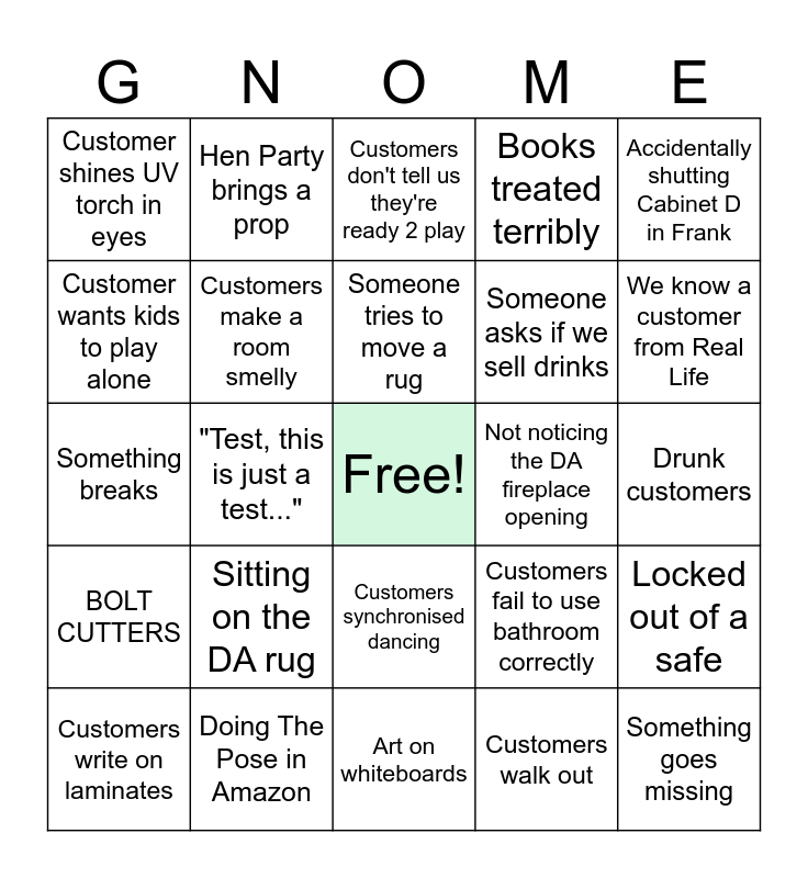This bingo card has a free space and 24 words: Sitting on the DA rug, Doing The Pose in Amazon, Someone tries to move a rug, Customers write on laminates, Accidentally shutting Cabinet D in Frank, Customer shines UV torch in eyes, Customer wants kids to play alone, Hen Party brings a prop, Not noticing the DA fireplace opening, Customers synchronised dancing, Someone asks if we sell drinks, Something breaks, Customers fail to use bathroom correctly, Locked out of a safe, Customers make a room smelly, Customers walk out, Drunk customers, Customers don't tell us they're ready 2 play, We know a customer from Real Life, "Test, this is just a test...", Something goes missing, BOLT CUTTERS, Books treated terribly and Art on whiteboards.