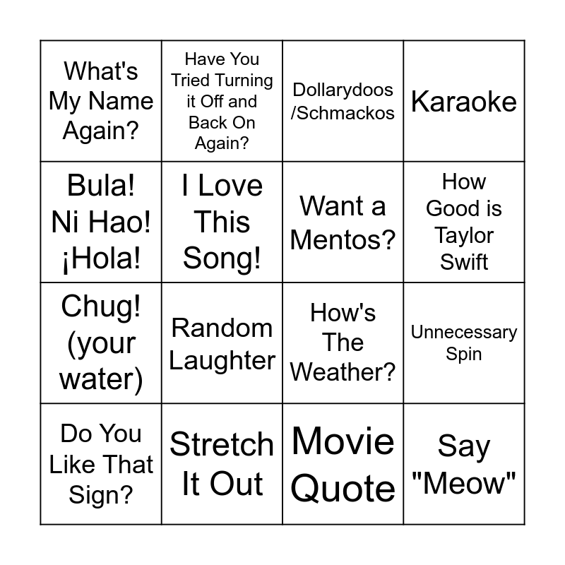 This bingo card has 16 words: Stretch It Out, Unnecessary Spin, Dollarydoos /Schmackos, What's My Name Again?, Chug! (your water), Have You Tried Turning it Off and Back On Again?, How's The Weather?, Movie Quote, Bula! Ni Hao! ¡Hola!, I Love This Song!, Do You Like That Sign?, Karaoke, Random Laughter, How Good is Taylor Swift, Want a Mentos? and Say "Meow".