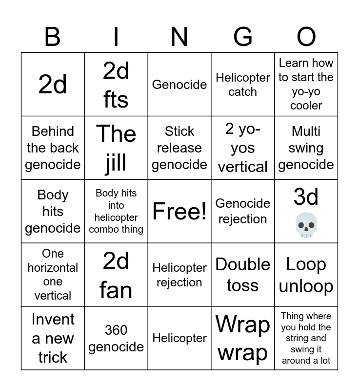 This bingo card has a free space and 24 words: 2d fan, 360 genocide, Stick release genocide, Invent a new trick, Learn how to start the yo-yo cooler, 2d, Behind the back genocide, 2d fts, Genocide rejection, Helicopter rejection, 2 yo-yos vertical, Body hits genocide, Double toss, Loop unloop, The jill, Wrap wrap, 3d 💀, Genocide, Multi swing genocide, Body hits into helicopter combo thing, Thing where you hold the string and swing it around a lot, One horizontal one vertical, Helicopter catch and Helicopter.