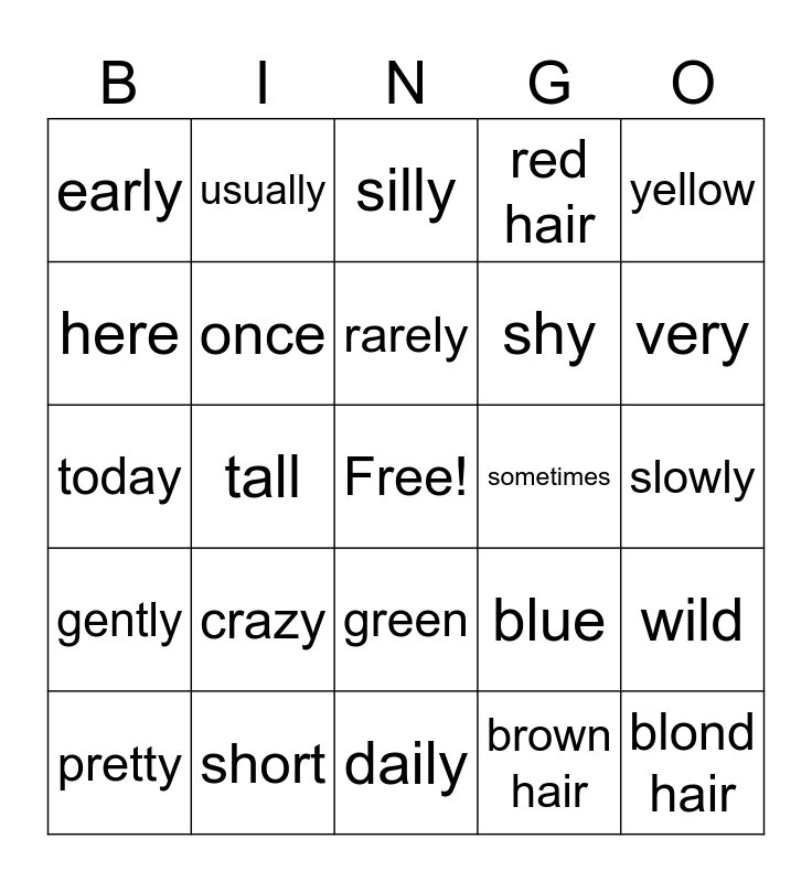 This bingo card has a free space and 29 words: pretty, soon, tall, quietly, early, silly, once, crazy, sometimes, short, slowly, blond hair, daily, brown hair, very, black hair, green, gently, yellow, today, blue, noisily, shy, here, red hair, usually, wild, rarely and thin.