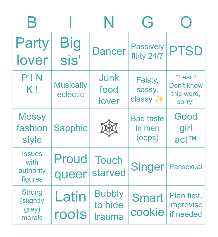 This bingo card has a free space and 24 words: Strong (slightly grey) morals, Proud queer, Junk food lover, Smart cookie, PTSD, Party lover, Big sis', Dancer, Bad taste in men (oops), Good girl act™️, Messy fashion style, Musically eclectic, Singer, Pansexual, P I N K !, Latin roots, Bubbly to hide trauma, Passively flirty 24/7, "Fear? Don't know this word, sorry", Issues with authority figures, Sapphic, Touch starved, Feisty, sassy, classy ✨ and Plan first, improvise if needed.