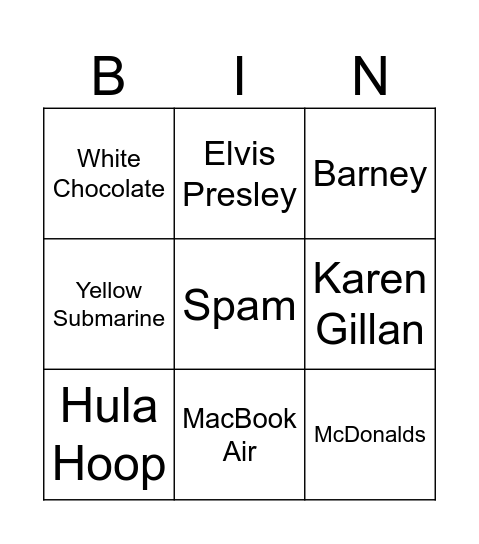 This bingo card has 9 words: Hula Hoop, Barney, Elvis Presley, Yellow Submarine, White Chocolate, Karen Gillan, Spam, McDonalds and MacBook Air.
