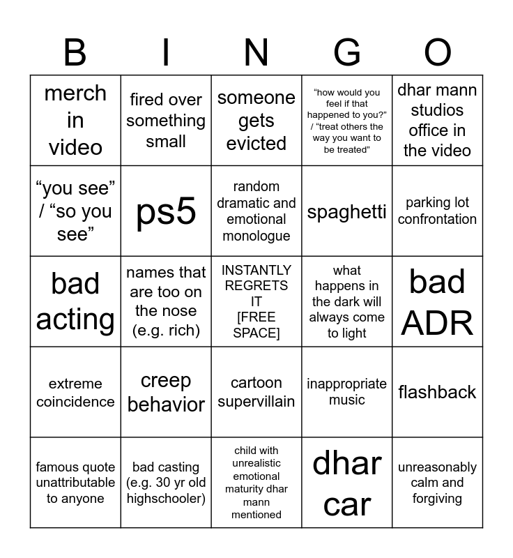 This bingo card has a free space and 48 words: time skip, unreasonably calm and forgiving, continuity error, child with unrealistic emotional maturity dhar mann mentioned, creep behavior, chekov’s ___, fired over something small, husband is fired, “you see” / “so you see”, kids with ipad, ps5, “how would you feel if that happened to you?” / “treat others the way you want to be treated”, flashback, inappropriate music, problematic lesson, bad green screen, random dramatic and emotional monologue, what happens in the dark will always come to light, clearly in the wrong person has an attitude, dhar mann studios office in the video, names that are too on the nose (e.g. rich), dhar car, merch in video, spaghetti, sexism, parking lot confrontation, famous quote unattributable to anyone, secretly rich, cartoon supervillain, extreme coincidence, credit card declined, dhar mann voiceover, random expensive brand mentioned or named (e.g. apple watch), bad props, bad casting (e.g. 30 yr old highschooler), random celebrity appearance, comically unrealistic person, bad ADR, dhar mann quotes himself, dont judge a book by its cover, POC plays broke character, someone begs for forgiveness, someone gets evicted, voiceover, bad acting, mc’s friends instantly turn on them, pigtail girl plays villain and unnecessary tone shift.
