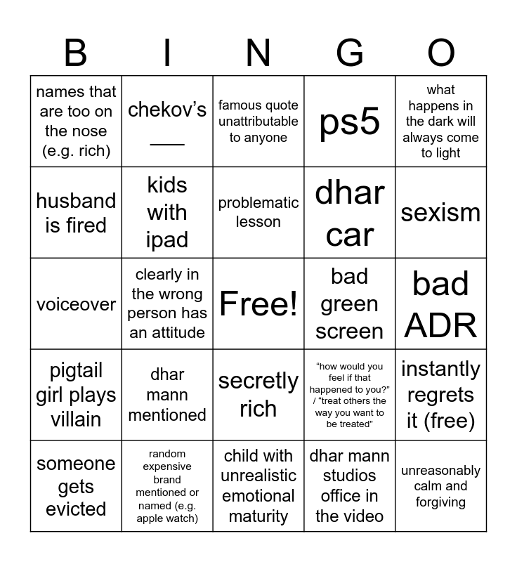 This bingo card has a free space and 50 words: time skip, unreasonably calm and forgiving, continuity error, child with unrealistic emotional maturity, dhar mann mentioned, creep behavior, chekov’s ___, fired over something small, husband is fired, “you see” / “so you see”, kids with ipad, ps5, instantly regrets it (free), “how would you feel if that happened to you?” / “treat others the way you want to be treated”, flashback, inappropriate music, problematic lesson, bad green screen, random dramatic and emotional monologue, what happens in the dark will always come to light, clearly in the wrong person has an attitude, dhar mann studios office in the video, names that are too on the nose (e.g. rich), dhar car, merch in video, spaghetti, sexism, parking lot confrontation, famous quote unattributable to anyone, secretly rich, cartoon supervillain, extreme coincidence, credit card declined, dhar mann voiceover, random expensive brand mentioned or named (e.g. apple watch), bad props, bad casting (e.g. 30 yr old highschooler), random celebrity appearance, comically unrealistic person, bad ADR, dhar mann quotes himself, dont judge a book by its cover, POC plays broke character, someone begs for forgiveness, someone gets evicted, voiceover, bad acting, mc’s friends instantly turn on them, pigtail girl plays villain and unnecessary tone shift.