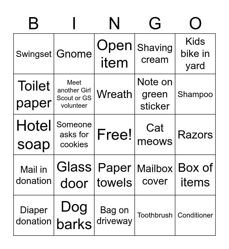 This bingo card has a free space and 24 words: Glass door, Dog barks, Wreath, Diaper donation, Kids bike in yard, Swingset, Toilet paper, Gnome, Cat meows, Paper towels, Note on green sticker, Hotel soap, Mailbox cover, Box of items, Meet another Girl Scout or GS volunteer, Toothbrush, Razors, Open item, Shampoo, Someone asks for cookies, Conditioner, Mail in donation, Shaving cream and Bag on driveway.