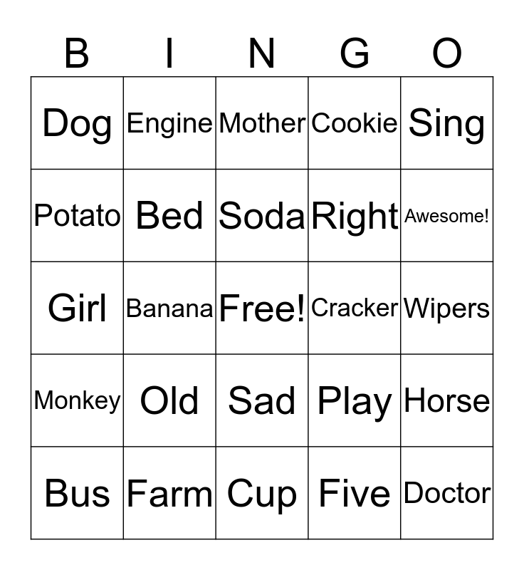 This bingo card has a free space and 24 words: Old, Farm, Soda, Bus, Sing, Dog, Potato, Engine, Cracker, Sad, Right, Girl, Play, Horse, Bed, Five, Wipers, Mother, Awesome!, Banana, Doctor, Monkey, Cookie and Cup.