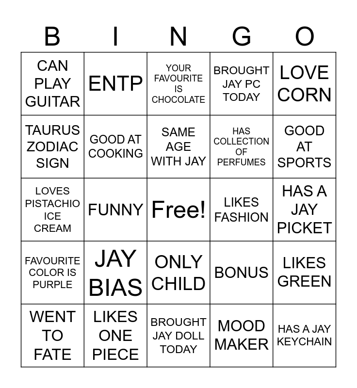 This bingo card has a free space and 25 words: JAY BIAS, BROUGHT JAY DOLL TODAY, SAME AGE WITH JAY, WENT TO FATE, LOVE CORN, CAN PLAY GUITAR, TAURUS ZODIAC SIGN, ENTP, LIKES FASHION, ONLY CHILD, HAS COLLECTION OF PERFUMES, LOVES PISTACHIO ICE CREAM, BONUS, LIKES GREEN, GOOD AT COOKING, BLACK CAT, HAS A JAY PICKET, YOUR FAVOURITE IS CHOCOLATE, GOOD AT SPORTS, FUNNY, HAS A JAY KEYCHAIN, LIKES ONE PIECE, FAVOURITE COLOR IS PURPLE, BROUGHT JAY PC TODAY and MOOD MAKER.