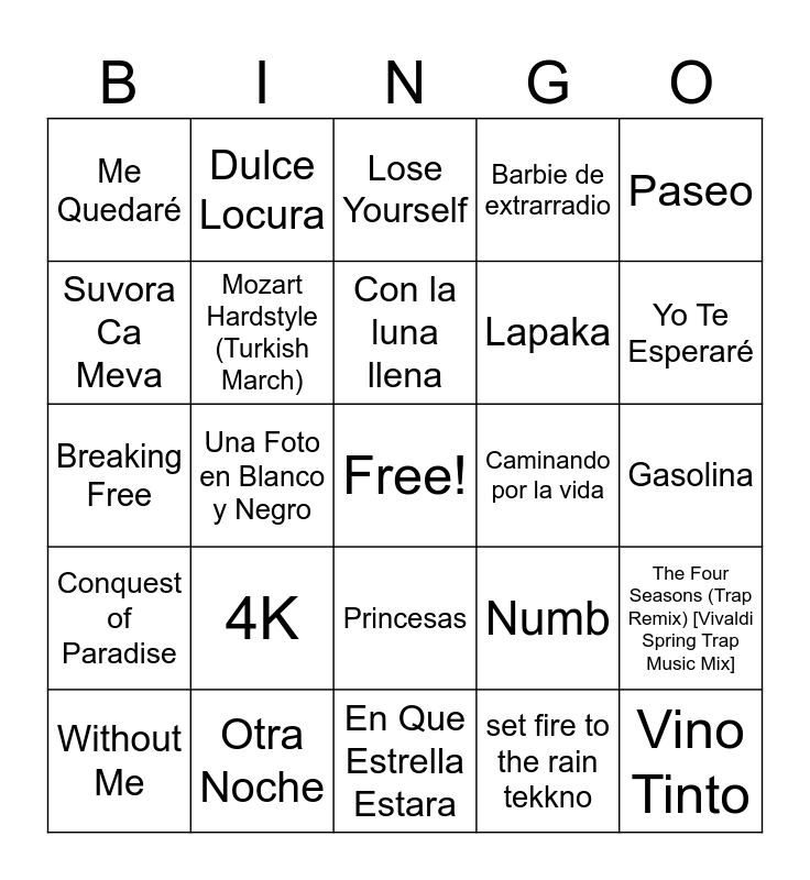 This bingo card has a free space and 61 words: Sóc el Rovelló (Remix), Otra Noche, This Is The Life, Conquest of Paradise, set fire to the rain tekkno, Barbie De Extrarradio - Hardstyle Remix, Mozart Hardstyle (Turkish March), Can Can (Hardstyle Mix), Lapaka, Can Can, Barbie de extrarradio, Turkish March, Suvora Ca Meva, Amparito Roca (Pasodoble Torero), Tornar a ser petits, Me Quedaré, Vino Tinto, Paseo, Partiendo la Pana, Con la luna llena, Caminando por la vida, Lose Yourself, Without Me, The Four Seasons (Trap Remix) [Vivaldi Spring Trap Music Mix], Carmina Burana: O Fortuna, Cuídate, Demasiadas Mujeres, Let's play, Yo Te Esperaré, Ding Dong Song - Radio Edit, Bring Me To Life, No_Se_Ve.mp3, La_Original.mp3, La Madre de Jose, Dulce Locura, Puedes Contar Conmigo, Imperfeccions, Una Foto en Blanco y Negro, Insoportable, Breaking Free, Una Vaina Loca, 4K, Gasolina, Pump It, Numb, mariposas, Shakira: Bzrp Music Sessions, Vol. 53, La Jumpa, PLAYA DEL INGLÉS, Princesas, En Que Estrella Estara, Tenia Tanto Que Darte, Nochentera, Remember the Name (feat. Styles of Beyond), Dragostea din tei, poker face tekkno, All I Want For Christmas Is You (Techno), All I Want for Christmas Is You, Stereo Love - Timmy Trumpet Remix, Ma Cherie - DJ Antoine & Mad Mark 2K12 Radio Edit and I Will Survive (Lalala), Original Radio Edit.
