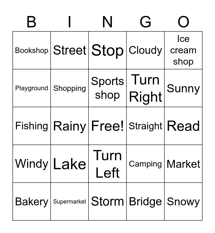 This bingo card has a free space and 24 words: Lake, Supermarket, Sports shop, Bakery, Ice cream shop, Bookshop, Playground, Street, Straight, Turn Left, Turn Right, Fishing, Camping, Market, Shopping, Bridge, Read, Stop, Sunny, Rainy, Snowy, Windy, Cloudy and Storm.
