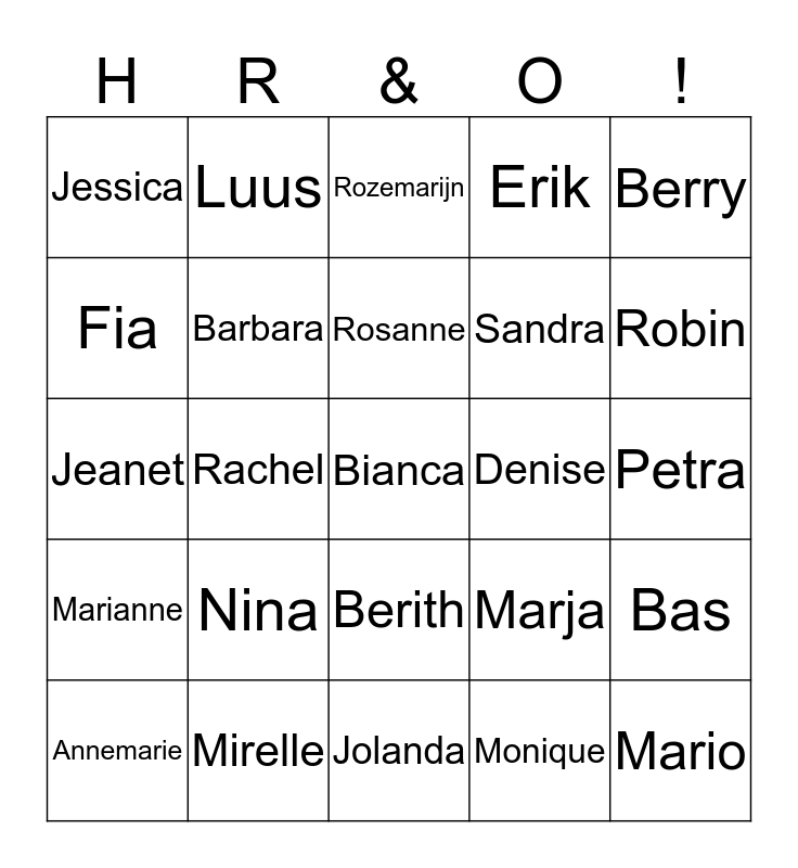 This bingo card has a free space and 24 words: Nina, Mirelle, Rosanne, Annemarie, Berry, Jessica, Fia, Luus, Denise, Berith, Sandra, Jeanet, Marja, Bas, Barbara, Monique, Petra, Rozemarijn, Robin, Rachel, Mario, Marianne, Erik and Jolanda.