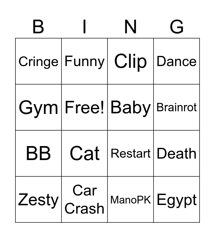 This bingo card has 16 words: Car Crash, Death, Clip, Cringe, BB, Funny, Restart, ManoPK, Gym, Free!, Zesty, Dance, Cat, Brainrot, Baby and Egypt.