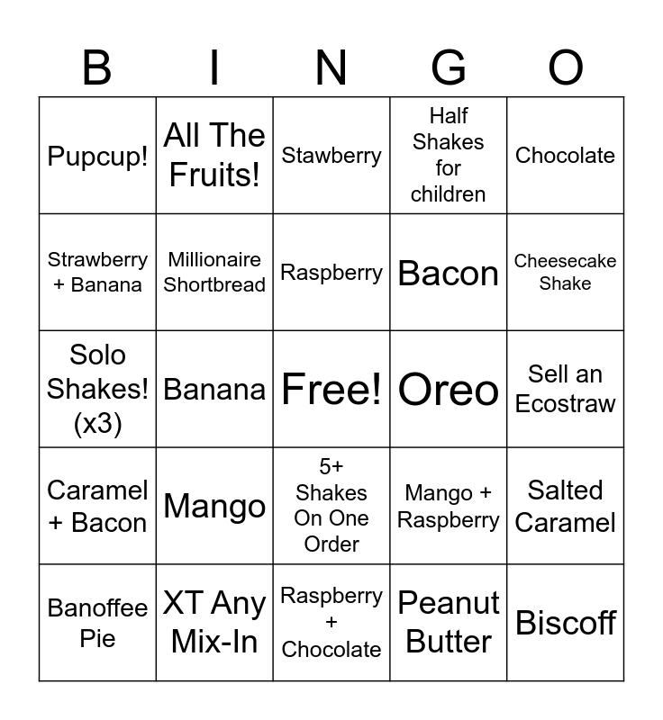 This bingo card has a free space and 24 words: Mango, XT Any Mix-In, Raspberry, Banoffee Pie, Chocolate, Pupcup!, Strawberry + Banana, All The Fruits!, Oreo, 5+ Shakes On One Order, Bacon, Solo Shakes! (x3), Mango + Raspberry, Salted Caramel, Millionaire Shortbread, Peanut Butter, Sell an Ecostraw, Stawberry, Cheesecake Shake, Banana, Biscoff, Caramel + Bacon, Half Shakes for children and Raspberry + Chocolate.