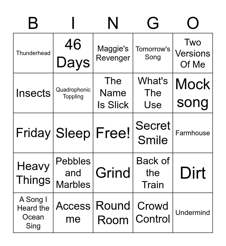 This bingo card has a free space and 43 words: Scents and subtle Sounds, Undermind, The Connection, A Song I Heard the Ocean Sing, Army of One, Crowd Control, Maggie's Revenger, Nothing, Two Versions Of Me, Access me, Tomorrow's Song, Secret Smile, Grind, Pebbles and Marbles, Anything but Me, Round Room, Mexican Cousin, Friday, Seven Below, Mock song, 46 Days, All of These Dreams, Walls of the Cave, Thunderhead, Waves, Farmhouse, Twist, Bug, Back of the Train, Heavy Things, Gotta Jibboo, Dirt, Piper, Sleep, Sand, First Tube, Me Left Toe, The Name Is Slick, Insects, What's The Use, Fish Bass, Quadrophonic Toppling and The Happy Whip and Dung Song.