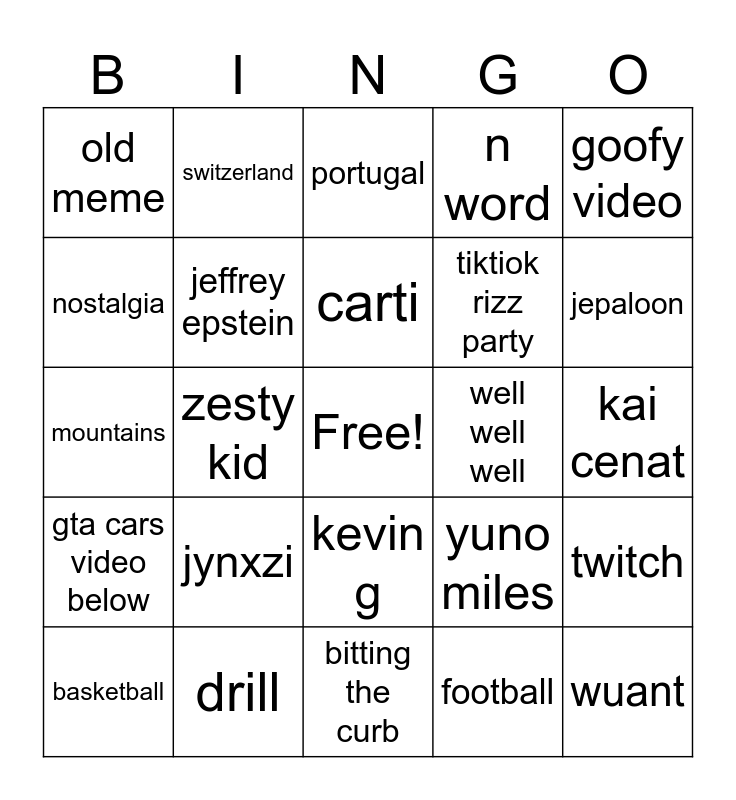 This bingo card has a free space and 29 words: basketball, goofy ahh sound, zesty kid, rustyn, old meme, portugal, jeffrey epstein, jynxzi, well well well, drill, kai cenat, wuant, bitting the curb, football, jepaloon, unc, kevin g, gta cars video below, goofy video, mountains, yuno miles, america RAAHHHH, tiktiok rizz party, nostalgia, n word, switzerland, twitch, carti and racism.