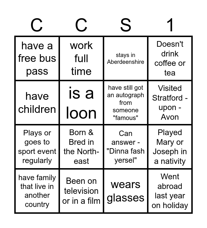 This bingo card has 20 words: Played Mary or Joseph in a nativity, loves musicals, stays in Aberdeenshire, been in a professional production (paid role, as a kid, extra, community company), have family that live in another country, have children, Been on television or in a film, have a free bus pass, Plays or goes to sport event regularly, work full time, Born & Bred in the North-east, Can answer - "Dinna fash yersel", is a loon, Went abroad last year on holiday, have still got an autograph from someone "famous", uses public transport to get to sessions., Visited Stratford - upon - Avon, Doesn't drink coffee or tea, wears glasses and grows vegetables in a garden/allotmen.