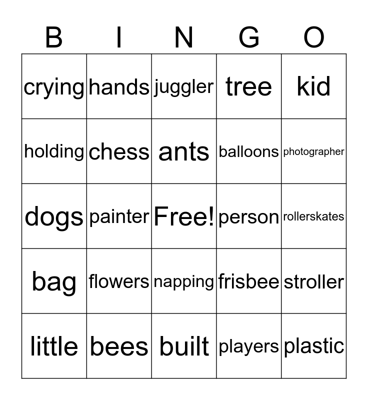 This bingo card has a free space and 24 words: flowers, bees, ants, little, kid, crying, holding, hands, person, napping, balloons, dogs, frisbee, stroller, chess, players, rollerskates, juggler, photographer, painter, plastic, bag, tree and built.