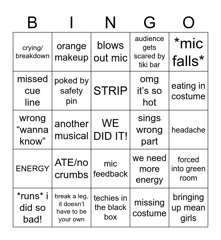 This bingo card has a free space and 24 words: ATE/no crumbs, break a leg, it doesn’t have to be your own, STRIP, *runs* i did so bad!, *mic falls*, crying/ breakdown, missed cue line, orange makeup, sings wrong part, mic feedback, omg it’s so hot, wrong “wanna know”, we need more energy, forced into green room, poked by safety pin, missing costume, headache, blows out mic, eating in costume, another musical, bringing up mean girls, ENERGY, audience gets scared by tiki bar and techies in the black box.