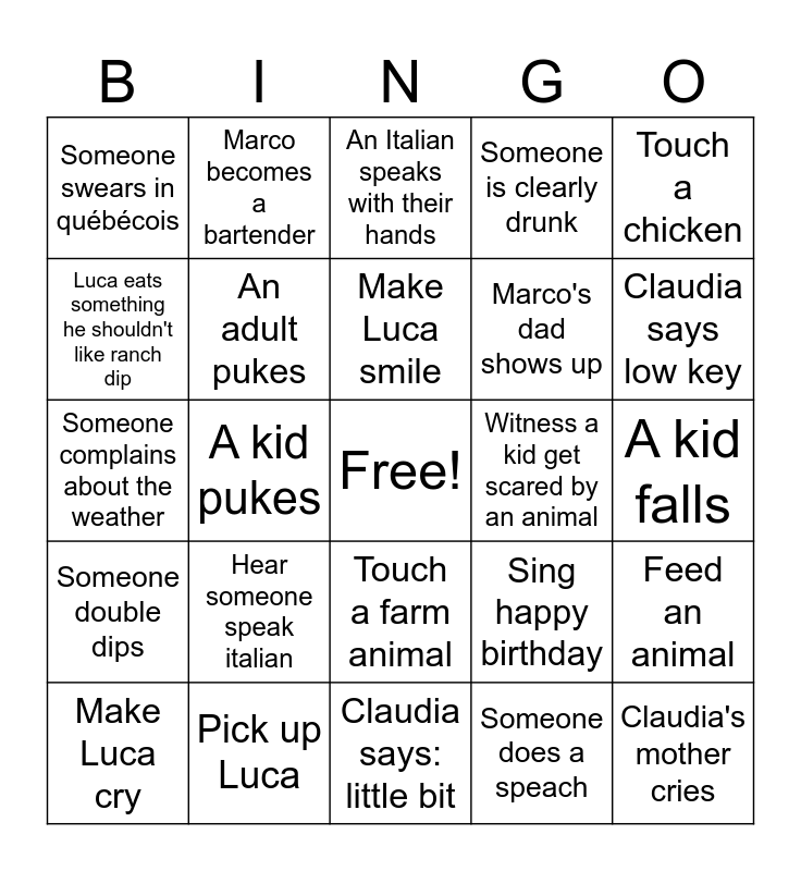 This bingo card has a free space and 24 words: Hear someone speak italian, Pick up Luca, Make Luca smile, Make Luca cry, Touch a chicken, Someone swears in québécois, Luca eats something he shouldn't like ranch dip, Marco becomes a bartender, Witness a kid get scared by an animal, Touch a farm animal, Marco's dad shows up, Someone complains about the weather, Sing happy birthday, Feed an animal, An adult pukes, Someone does a speach, A kid falls, An Italian speaks with their hands, Claudia says low key, A kid pukes, Claudia's mother cries, Someone double dips, Someone is clearly drunk and Claudia says: little bit.