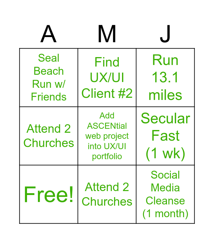 This bingo card has a free space and 8 words: Secular Fast (1 wk), Run 13.1 miles, Find UX/UI Client #2, Free!, Seal Beach Run w/ Friends, Social Media Cleanse (1 month), Attend 2 Churches and Attend 2 Churches.