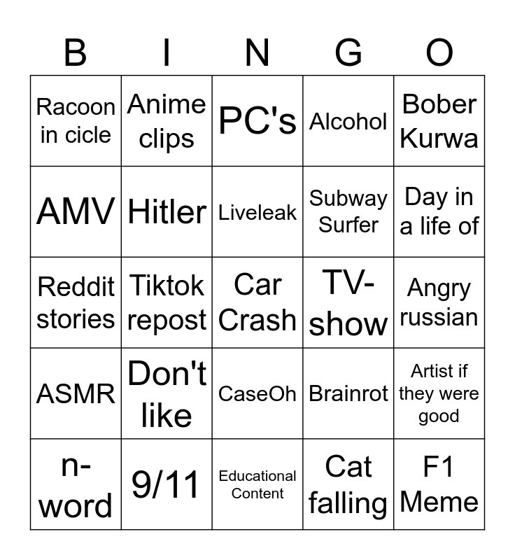 This bingo card has a free space and 24 words: Don't like, 9/11, Liveleak, n-word, Bober Kurwa, Racoon in cicle, AMV, Anime clips, TV-show, CaseOh, Subway Surfer, Reddit stories, Brainrot, Artist if they were good, Hitler, Cat falling, Angry russian, PC's, Day in a life of, Tiktok repost, F1 Meme, ASMR, Alcohol and Educational Content.