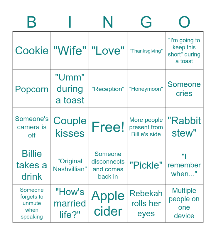 This bingo card has a free space and 32 words: Rebekah rolls her eyes, Bumble, Couple kisses, Rebekah takes a drink, Billie takes a drink, "Umm" during a toast, "I'm going to keep this short" during a toast, "I remember when...", "Wife", "Husband", "Reception", "Love", Billie uses a phrase that doesn't make sense, More people present from Rebekah's side, More people present from Billie's side, "I don't know how this works", Someone forgets to unmute when speaking, Someone's camera is off, Someone disconnects and comes back in, "Original Nashvillian", "Pickle", "Lucky rabbit's foot", "Rabbit stew", "How's married life?", Multiple people on one device, "Thanksgiving", "Honeymoon", Popcorn, Cookie, Apple cider, Thank you note and Someone cries.