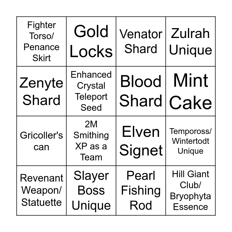 This bingo card has 16 words: Slayer Boss Unique, Tempoross/ Wintertodt Unique, Venator Shard, Fighter Torso/ Penance Skirt, Gricoller's can, Gold Locks, Elven Signet, Pearl Fishing Rod, Zenyte Shard, Enhanced Crystal Teleport Seed, Revenant Weapon/ Statuette, Zulrah Unique, 2M Smithing XP as a Team, Mint Cake, Blood Shard and Hill Giant Club/ Bryophyta Essence.