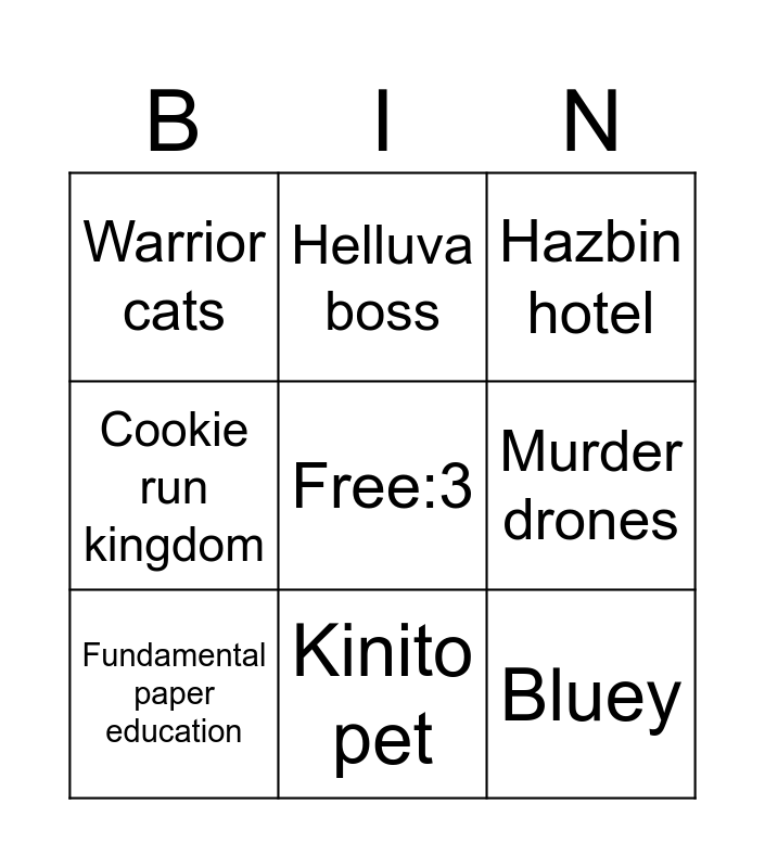 This bingo card has a free space and 8 words: Murder drones, Hazbin hotel, Helluva boss, Fundamental paper education, Warrior cats, Bluey, Cookie run kingdom and Kinito pet.