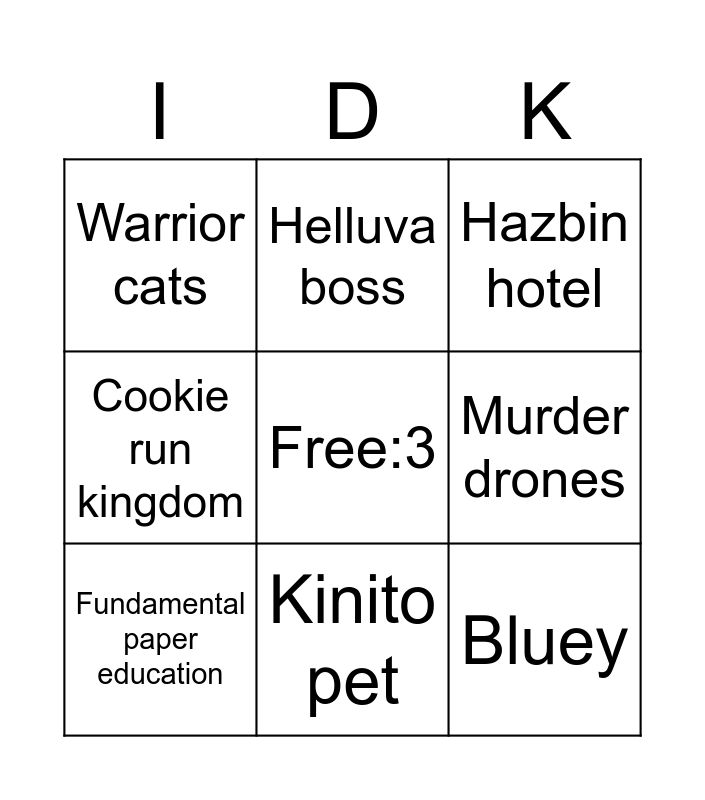 This bingo card has a free space and 8 words: Murder drones, Hazbin hotel, Helluva boss, Fundamental paper education, Warrior cats, Bluey, Cookie run kingdom and Kinito pet.