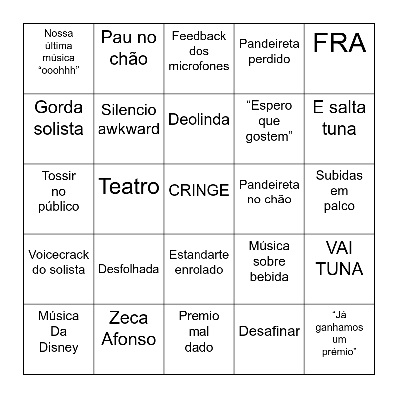 This bingo card has a free space and 24 words: Desfolhada, Zeca Afonso, Deolinda, Música Da Disney, FRA, Nossa última música “ooohhh”, Gorda solista, Pau no chão, Pandeireta no chão, Estandarte enrolado, “Espero que gostem”, Tossir no público, Música sobre bebida, VAI TUNA, Silencio awkward, Desafinar, Subidas em palco, Feedback dos microfones, E salta tuna, Teatro, “Já ganhamos um prémio”, Voicecrack do solista, Pandeireta perdido and Premio mal dado.