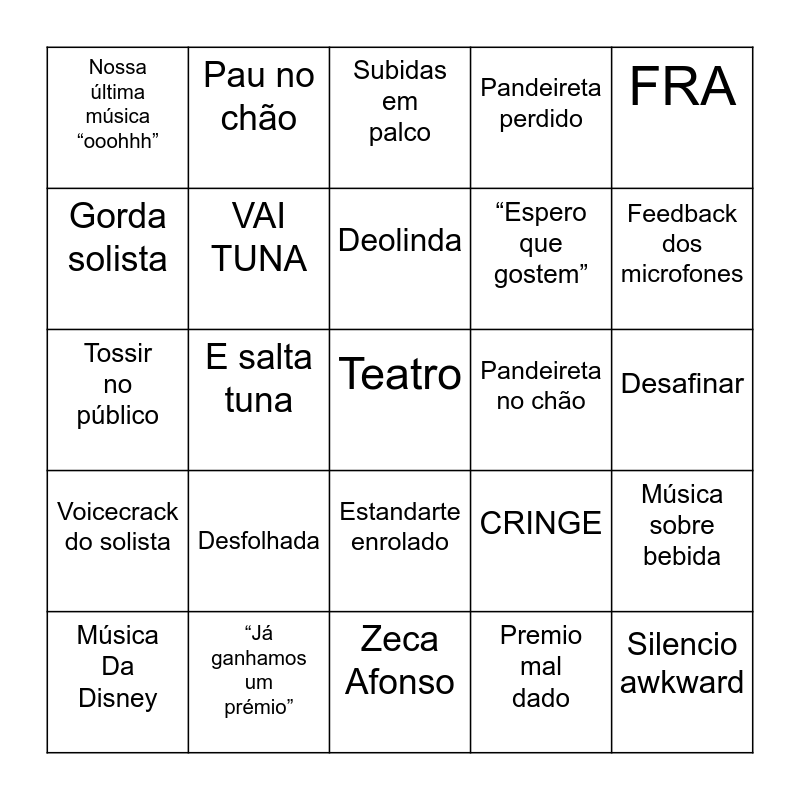 This bingo card has 25 words: Desfolhada, Zeca Afonso, Deolinda, Música Da Disney, FRA, Nossa última música “ooohhh”, Gorda solista, Pau no chão, Pandeireta no chão, Estandarte enrolado, “Espero que gostem”, Tossir no público, CRINGE, Música sobre bebida, VAI TUNA, Silencio awkward, Desafinar, Subidas em palco, Feedback dos microfones, E salta tuna, Teatro, “Já ganhamos um prémio”, Voicecrack do solista, Pandeireta perdido and Premio mal dado.