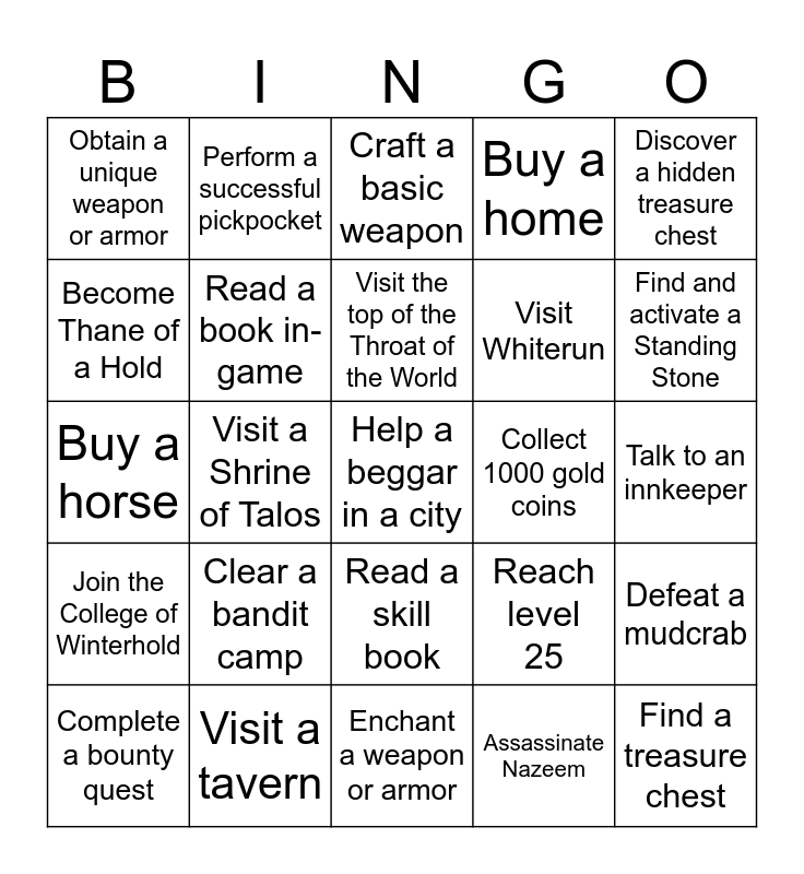 This bingo card has 25 words: Clear a bandit camp, Enchant a weapon or armor, Visit the top of the Throat of the World, Complete a bounty quest, Discover a hidden treasure chest, Obtain a unique weapon or armor, Become Thane of a Hold, Perform a successful pickpocket, Collect 1000 gold coins, Read a skill book, Visit Whiterun, Buy a horse, Reach level 25, Defeat a mudcrab, Read a book in-game, Find a treasure chest, Talk to an innkeeper, Craft a basic weapon, Find and activate a Standing Stone, Visit a Shrine of Talos, Help a beggar in a city, Visit a tavern, Join the College of Winterhold, Buy a home and Assassinate Nazeem.