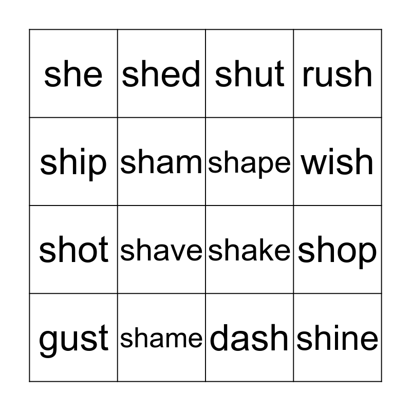This bingo card has a free space and 15 words: gust, shine, shut, she, wish, ship, shave, dash, sham, shot, shop, rush, shape, shed and shame.