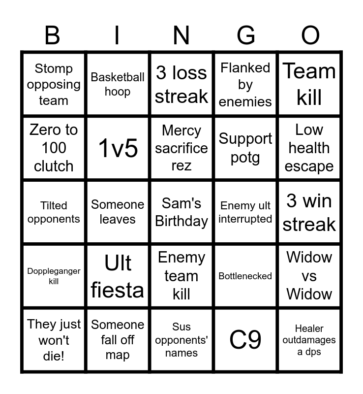 This bingo card has a free space and 24 words: Ult fiesta, Someone fall off map, Mercy sacrifice rez, They just won't die!, Team kill, Stomp opposing team, Zero to 100 clutch, Basketball hoop, Enemy ult interrupted, Enemy team kill, Support potg, Tilted opponents, Bottlenecked, Widow vs Widow, 1v5, C9, 3 win streak, 3 loss streak, Low health escape, Someone leaves, Healer outdamages a dps, Doppleganger kill, Flanked by enemies and Sus opponents' names.