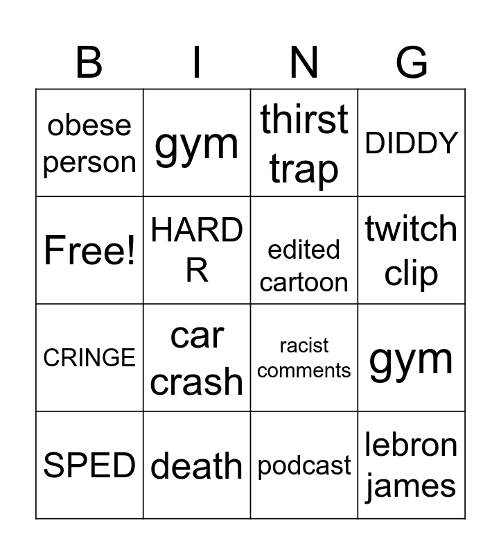 This bingo card has 16 words: death, gym, thirst trap, obese person, CRINGE, gym, racist comments, podcast, Free!, HARD R, SPED, DIDDY, car crash, twitch clip, edited cartoon and lebron james.