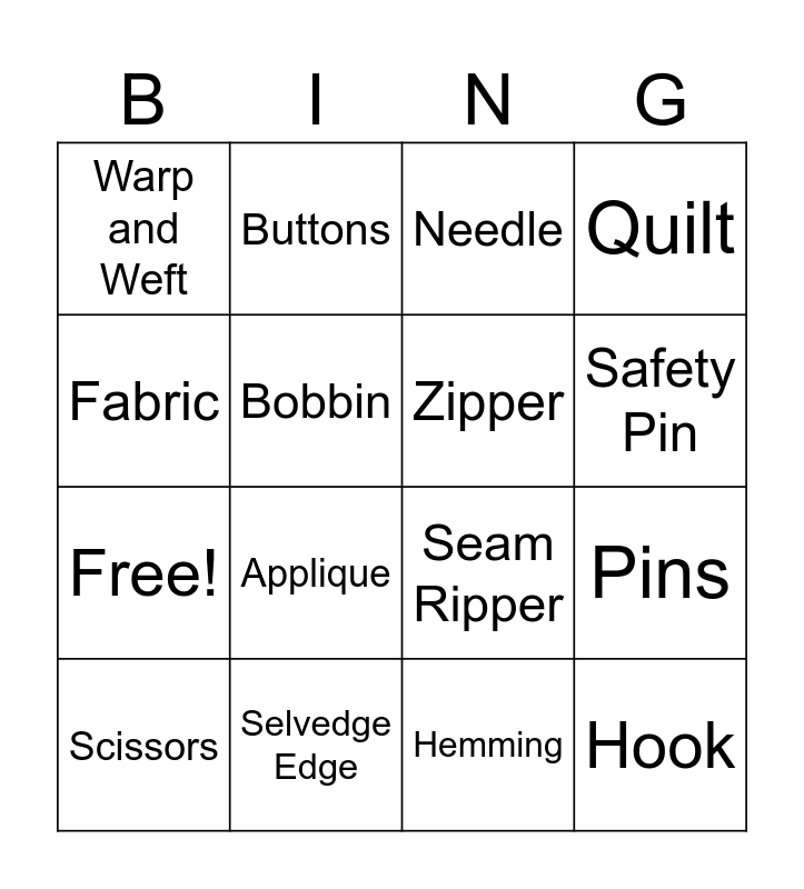 This bingo card has 20 words: Pins, Sewing Machine, Needle, Overlocker, Scissors, Fabric, Selvedge Edge, Warp and Weft, Free!, Buttons, Applique, Seam Ripper, Bobbin, Hook, Zipper, Pencil, Safety Pin, Quilt, Hemming and Thread.