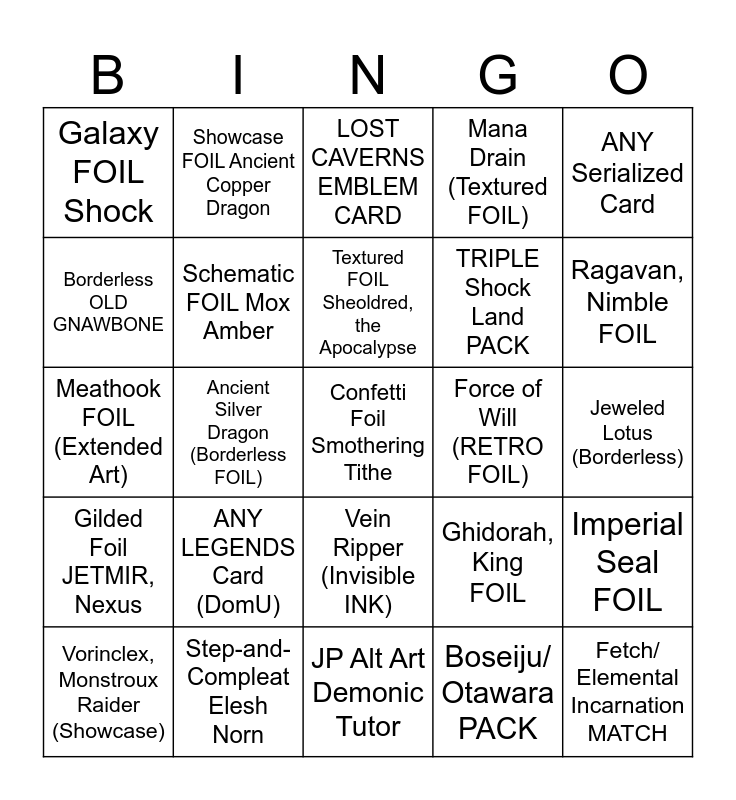 This bingo card has a free space and 24 words: Vorinclex, Monstroux Raider (Showcase), ANY LEGENDS Card (DomU), Textured FOIL Sheoldred, the Apocalypse, Boseiju/ Otawara PACK, ANY Serialized Card, Galaxy FOIL Shock, Showcase FOIL Ancient Copper Dragon, LOST CAVERNS EMBLEM CARD, Force of Will (RETRO FOIL), Jeweled Lotus (Borderless), Meathook FOIL (Extended Art), Schematic FOIL Mox Amber, Ghidorah, King FOIL, Imperial Seal FOIL, Borderless OLD GNAWBONE, Step-and-Compleat Elesh Norn, JP Alt Art Demonic Tutor, Mana Drain (Textured FOIL), Ragavan, Nimble FOIL, Gilded Foil JETMIR, Nexus, Ancient Silver Dragon (Borderless FOIL), Vein Ripper (Invisible INK), TRIPLE Shock Land PACK and Fetch/ Elemental Incarnation MATCH.