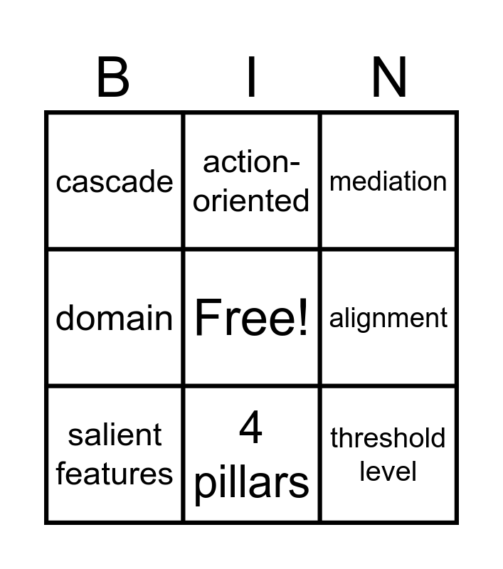 This bingo card has a free space and 11 words: social agent, 4 pillars, threshold level, salient features, action-oriented, mediation, alignment, interaction, domain, cascade and global scale.