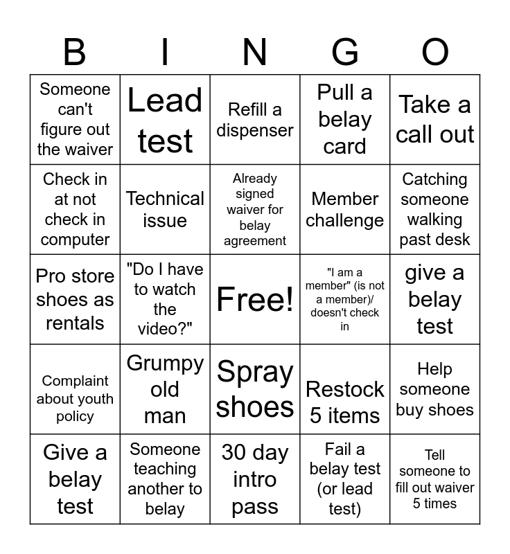 This bingo card has a free space and 24 words: Grumpy old man, Someone teaching another to belay, Already signed waiver for belay agreement, Give a belay test, Take a call out, Someone can't figure out the waiver, Check in at not check in computer, Lead test, "I am a member" (is not a member)/ doesn't check in, Spray shoes, Member challenge, Pro store shoes as rentals, Restock 5 items, Help someone buy shoes, Technical issue, Fail a belay test (or lead test), give a belay test, Refill a dispenser, Catching someone walking past desk, "Do I have to watch the video?", Tell someone to fill out waiver 5 times, Complaint about youth policy, Pull a belay card and 30 day intro pass.
