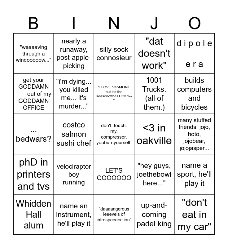 This bingo card has 35 words: heckinmagargin, "i'll be home late", 59 chicken nuggets, "i'm dying... you killed me... it's murder...", LET'S GOOOOOO, "dat doesn't work", get your GODDAMN ___ out of my GODDAMN OFFICE, "welcome to the world, little man", "i LOVE Ver-MONT but it's the seasonofthesTICKS--", 23 yr old body, 83 yr old digestive system, ... bedwars?, d i p o l e e r a, Factory Engine (TM), Alfield Jr. & Friends (:, "waaaaving through a windooooow...", <3 in oakville, up-and-coming padel king, costco salmon sushi chef, phD in printers and tvs, don't. touch. my. compressor. youburnyourself., "hey guys, joethebowl here...", Whidden Hall alum, name a sport, he'll play it, name an instrument, he'll play it, silly sock connosieur, builds computers and bicycles, "don't eat in my car", Aurora High School Male Athlete of the Year, 1001 Trucks. (all of them.), many stuffed friends: jojo, hoto, jojobear, jojojasper..., UN Ambassador for Japan (Mao's friend), "daaaangerous leeevels of introspeeeection", velociraptor boy running, nearly a runaway, post-apple-picking and gotta MUCK this real quick.
