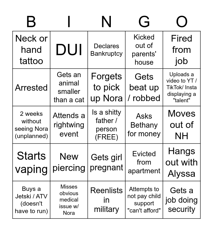 This bingo card has a free space and 24 words: New piercing, Misses obvious medical issue w/ Nora, Forgets to pick up Nora, Buys a Jetski / ATV (doesn't have to run), Fired from job, Neck or hand tattoo, Arrested, DUI, Asks Bethany for money, Gets girl pregnant, Gets beat up / robbed, 2 weeks without seeing Nora (unplanned), Evicted from apartment, Hangs out with Alyssa, Gets an animal smaller than a cat, Attempts to not pay child support "can't afford", Moves out of NH, Declares Bankruptcy, Uploads a video to YT / TikTok/ Insta displaying a "talent", Attends a rightwing event, Gets a job doing security, Starts vaping, Kicked out of parents' house and Reenlists in military.