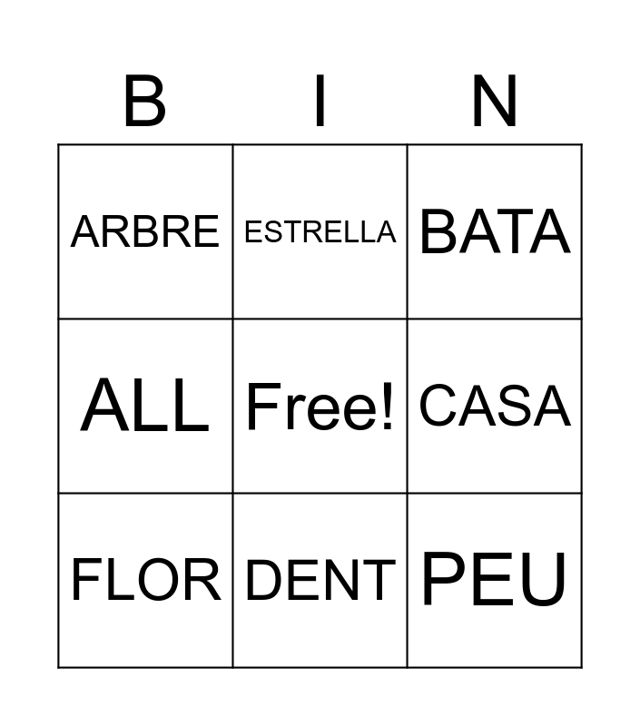 This bingo card has a free space and 40 words: MÀ, PA, PI, FLOR, ULL, SOL, DENT, NEU, PEU, GAT, GOS, ALL, BOSC, JOC, POMA, PERA, SOPA, ARBRE, PALA, BATA, FULLA, PLUJA, BOCA, CASA, DINAR, INDI, LLUNA, MOSCA, ILLA, NINA, ZEBRA, POTA, QUILO, BINGO, VELA, PILOTA, PANTALÓ, PINTURA, ESTRELLA and RATOLÍ.