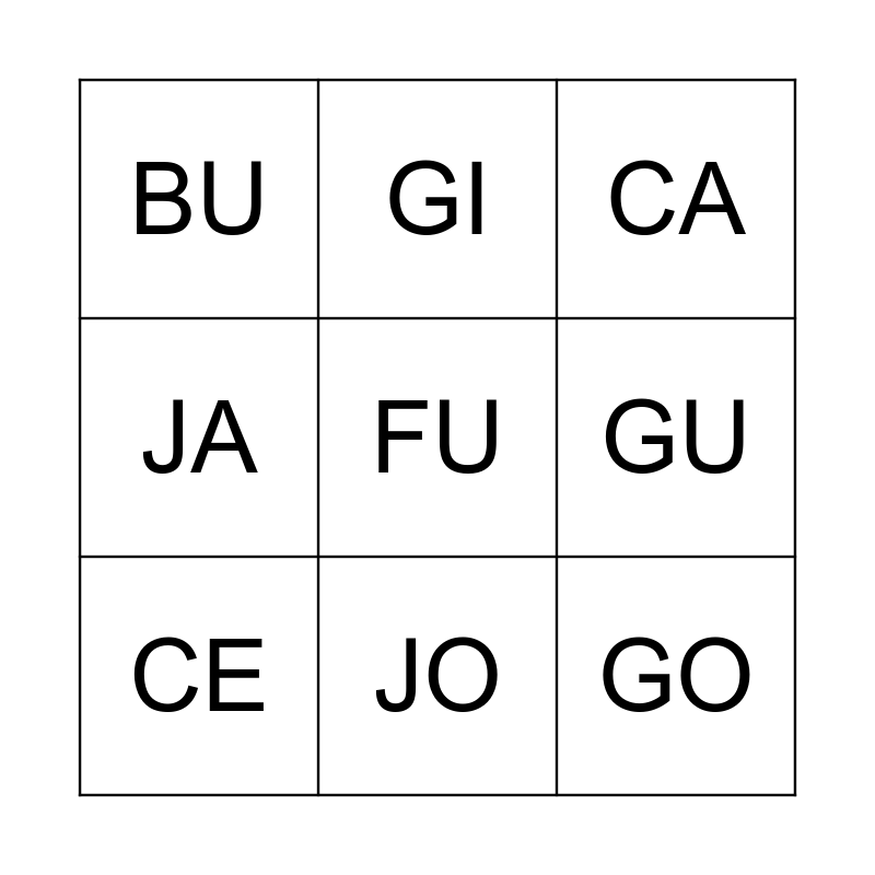 This bingo card has 30 words: BA, BA, BI, BO, BU, CA, CE, CI, CO, CU, DA, DE, DI, DO, DU, FA, FE, FI, FO, FU, GA, GE, GI, GO, GU, JA, JE, JI, JO and JU.